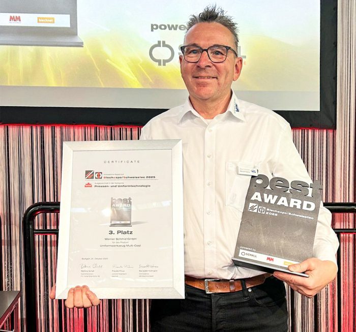 Der „best-Award“ wird alle zwei Jahre auf der internationalen Fachmesse „Blechexpo/Schweisstec“ in Stuttgart verliehen – einem der wichtigsten Branchentreffs weltweit mit über 1.200 Ausstellern aus 40 Ländern. Eine Fachjury aus Expertinnen und Experten der Industrie sowie Fachredaktionen zeichnet dabei herausragende Innovationen in fünf Kategorien aus. Die Werner Schmid GmbH erzielte mit dem innovativen Werkzeugkonzept „Multi-Cool“ den dritten Platz in der Kategorie „Pressen- und Umformtechnologie“ – und war zugleich der einzige Metallumformer, der in diesem Jahr prämiert wurde.