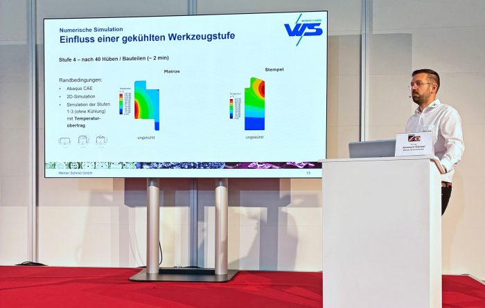 In einem Fachvortrag stellte Projektleiter Dr. Janosch Günzel von Werner Schmid das innovative Projekt im Rahmenprogramm der Messe vor. „Bei ‚Multi-Cool‘ geht es um einen innovativen Ansatz zur Kühlung von Werkzeugen während mehrstufiger Umformprozesse von Metall“, erklärt er. „Die additive Fertigung, umgangssprachlich als 3D-Druck bekannt, bietet uns völlig neue Möglichkeiten bei der Auslegung von Kühlkanälen in Werkzeugkomponenten. Daraus resultiert eine signifikante Verbesserung der Kühlleistung mit positiven Auswirkungen auf die Stabilität des Produktionsprozesses und die Qualität der hergestellten Bauteile.“